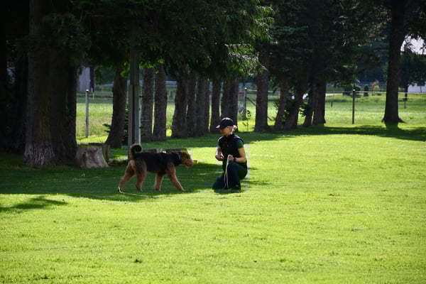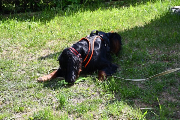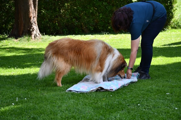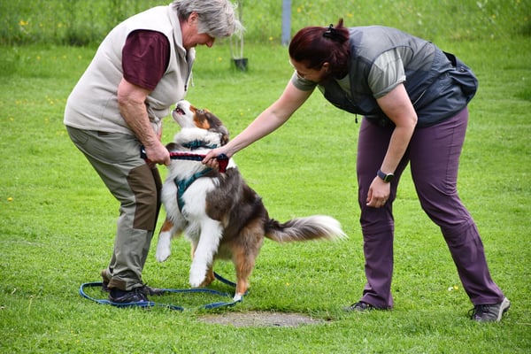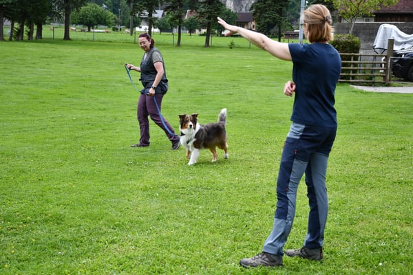 Am Nachmittag ging es ans praktische Arbeiten. In Gruppen wurden für die gewünschten Themen der Kursteilnehmenden (unerwünschtes Jagdverhalten, Dauerbellen, Leinenaggression, Überdrehen, Ablenkung durch "geliebte" Menschen und Gegenstand tragen) Trainingspläne erstellt. Die Gruppen konnten danach ihre Pläne mit der fachkompetenten Unterstützung von Gaby Leuenberger mit den Teams umsetzen. Eindrücklich war beispielsweise, dass der dauerbellende Hund plötzlich herunterfahren konnte und ruhig wurde. Den Teilnehmenden wurde klar gemacht, dass das Gelernte durch weiteres konsequentes Training im Alltag gefestigt werden muss.