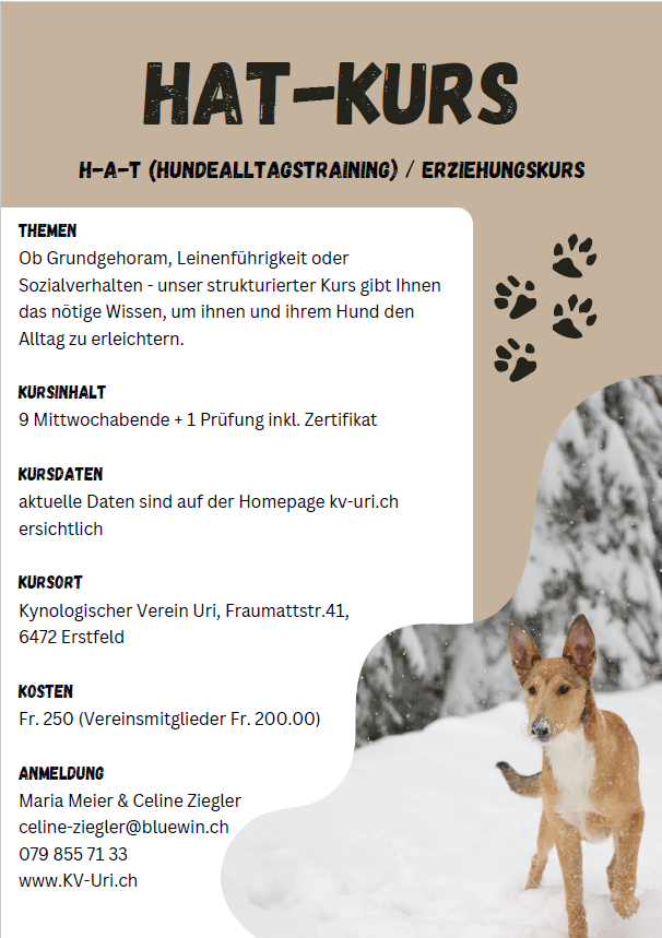 Das Impfbüchlein ist am ersten Kursabend mitzunehmen. Hunde ohne genügenden Impfschutz werden vom Kurs ausgeschlossen.